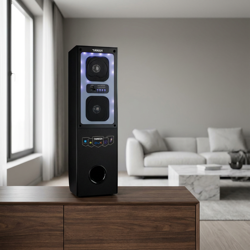 Its tall tower structure ensures wider sound dispersion, making it ideal for music, movies, parties, and home entertainment. Stylish LED lighting around the speakers adds a premium visual appeal, while the front control panel allows easy access to essential functions. Tanish DHOOM-1 combines power, design, and durability for an immersive audio experience.